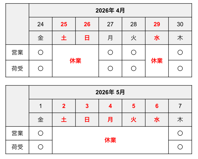 弊社では下記の期間、ゴールデンウィークの休業日とさせていただきます。