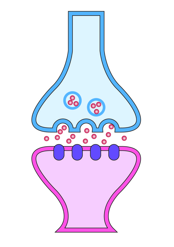 神経の細胞は、信号を隣の細胞へ伝えるために、その端で神経伝達物質というものを放出します。そのために、神経細胞の端には神経伝達物質を作るタンパク質があります。同様に、神経伝達物質を隣の神経細胞から受け取るためのタンパク質もあります。神経伝達物質を受け取るためのタンパク質は、細胞の表面から外へ突き出ています。