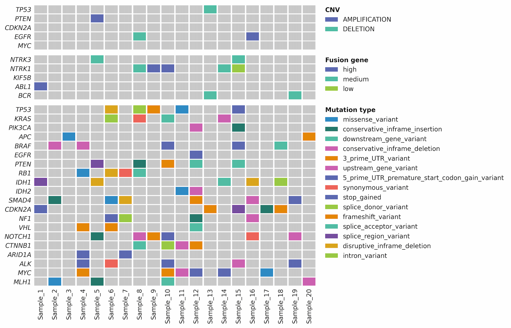ドライバー遺伝子探索解析では、がん細胞のゲノム変異と遺伝子発現プロファイルから、腫瘍の発生や進行を促進するドライバー遺伝子の候補を探索します。 正常・腫瘍細胞からそれぞれDNAとRNAのサンプルをご提供いただき、WESとRNA-seqを実施します。WESデータからは遺伝子変異やコピー数変化を、RNA-seqデータからは遺伝子発現量、融合遺伝子、スプライシング異常を網羅的に解析します。 さらに、これらのデータを統合解析することで、個別の解析だけでは見つけにくいドライバー遺伝子の候補を効率的に絞り込むことが可能です。