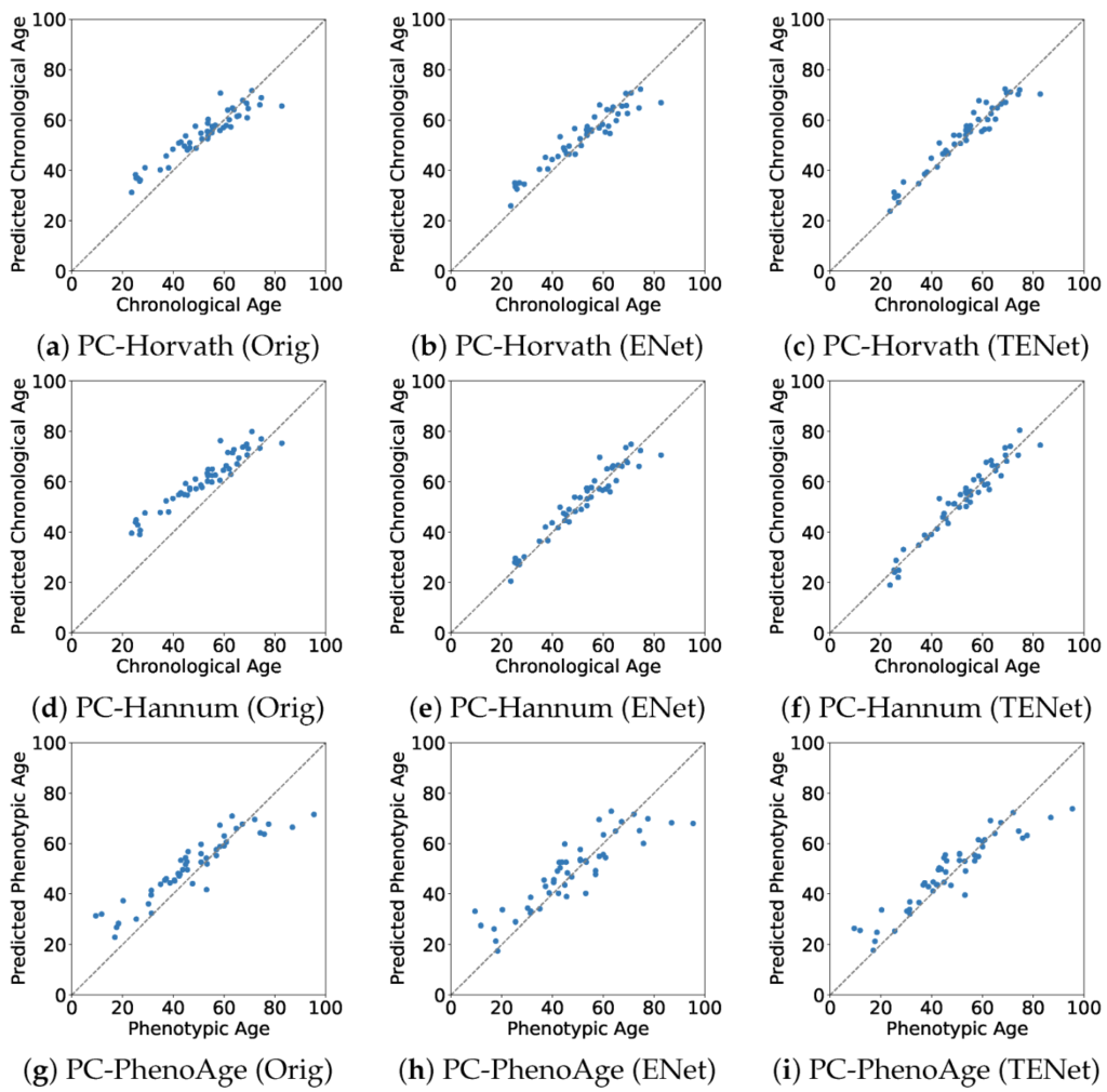 本研究では、Transfer Elastic Net(TENet)という新しい転移学習技術を提案し、日本人集団に特化したエピジェネティック・クロックを開発しました。TENetは、Elastic Net (ENet)で訓練された既存モデルから得たパラメータ情報を活用し、少数のサンプルでも精度の高いクロックを構築することが可能です。本研究では、このTENetを用い、日本人143名のDNAメチル化データから、Horvath、Hannum、PhenoAgeクロックを構築しました。特に、主成分分析法(PCA)を用いて技術的ノイズを削減した、信頼性の高いPCクロックモデル(PC-Horvath、PC-Hannum、PC-PhenoAge)を構築し、構築に使用していない50名の日本人データ(評価セット)に適用することでENetおよびTENetとの比較を行いました。解析結果から、TENetを用いたクロックは、ENetや既存のクロックと比較し、予測誤差が小さく、バイアスが大幅に減少しました(図1)。また、TENetは既存のモデルと高い類似性を保ちながら、日本人集団に適したパラメータ推定を実現しました。これにより、日本人に特化した高精度のエピジェネティック・クロックが構築され、寿命、健康・疾患リスクの評価が可能となり、老化予防分野での応用が期待されます。