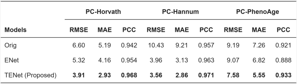 本研究は、新たな転移学習手法であるTransfer Elastic Net*3(以下「TENet」)を新たに考案し、日本人集団に特化したエピジェネティック・クロックを開発しました。TENetは、既存のモデルから得たパラメータを利用することで、少数のサンプルで高精度な予測モデルを構築できる手法です。これにより、日本人に適した年齢評価モデルを開発し、高い生物学的年齢評価精度を実現しました。