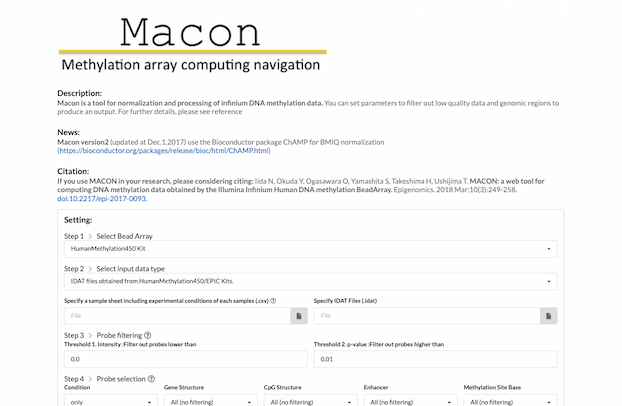 Macon(Methylation Array Computing Navigation)は、国立研究開発法人 国立がん研究センター、分子診断・個別化医療開発グループ エピゲノム解析分野 牛島研究室が開発した、DNAメチル化アレイデータ解析システムです。