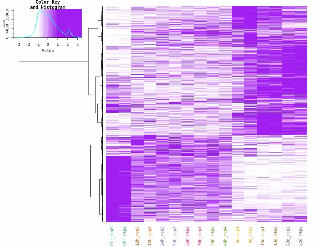 データ解析では、変動ピーク領域の検出を実施し、2群間において、シグナル値が有意に変動しているピークを統計的に算出し、変動ピーク領域とその近傍遺伝子のリストに加え、ピーク領域に絞ったヒートマップおよびシグナルヒートマップをご覧いただけます。